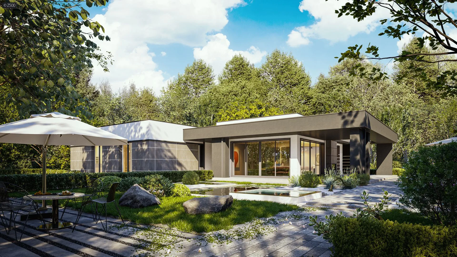 Zx168153 + 35 m²Modernus vieno aukšto namas su aiškiais zonų padalijimais ir išoriniu židiniu.